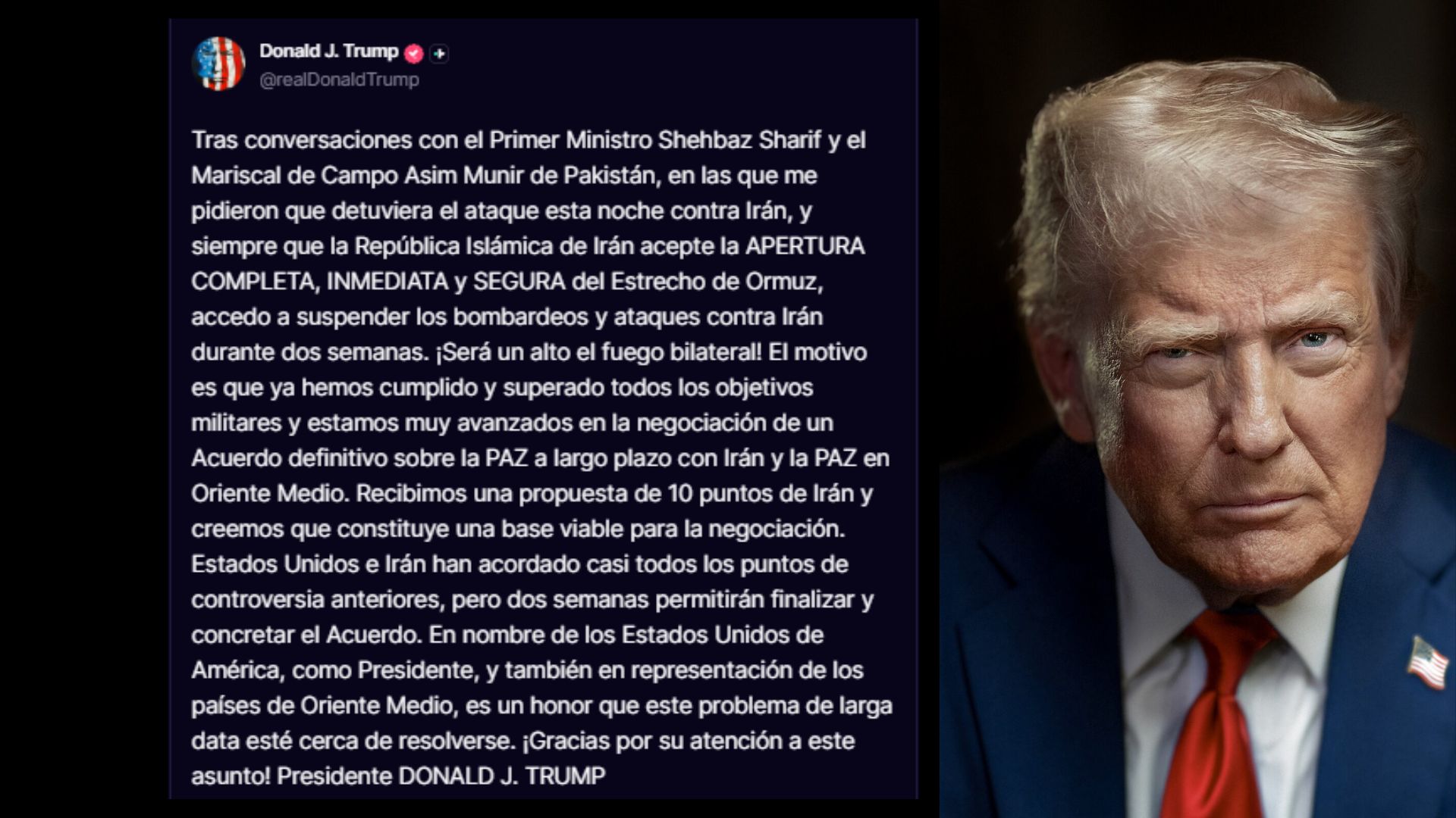 El presidente de Estados Unidos, Donald Trump, anunció la suspensión de los bombardeos contra Irán durante dos semanas, condicionada a la reapertura “completa, inmediata y segura” del estrecho de Ormuz. El mandatario calificó la medida como un “alto el fuego bilateral” y aseguró que ya se han cumplido los principales objetivos militares. Además, señaló que existe un avance significativo hacia un acuerdo de paz duradero en Oriente Medio. Trump describió el plan iraní de diez puntos como una base “viable” para negociar y confía en cerrar un pacto definitivo en este plazo.