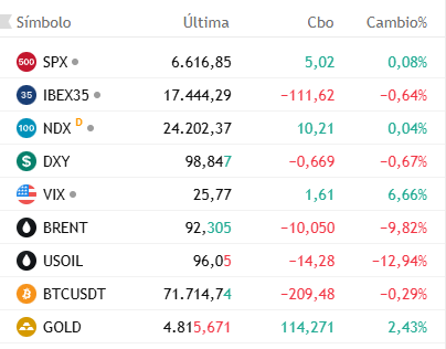 Los mercados reaccionaron con fuerza al alto el fuego de dos semanas entre Estados Unidos e Irán. El petróleo registró caídas históricas, con el West Texas Intermediate desplomándose hasta un 19% y el Brent bajando un 13%, ante la expectativa de normalización del flujo por el estrecho de Ormuz. En paralelo, las bolsas globales repuntaron con fuerza: el MSCI Asia Pacífico subió un 4,5% y los futuros de Wall Street avanzaron más del 2%. La caída del crudo alivia temores inflacionarios y reaviva expectativas de recortes de tipos por la Reserva Federal.